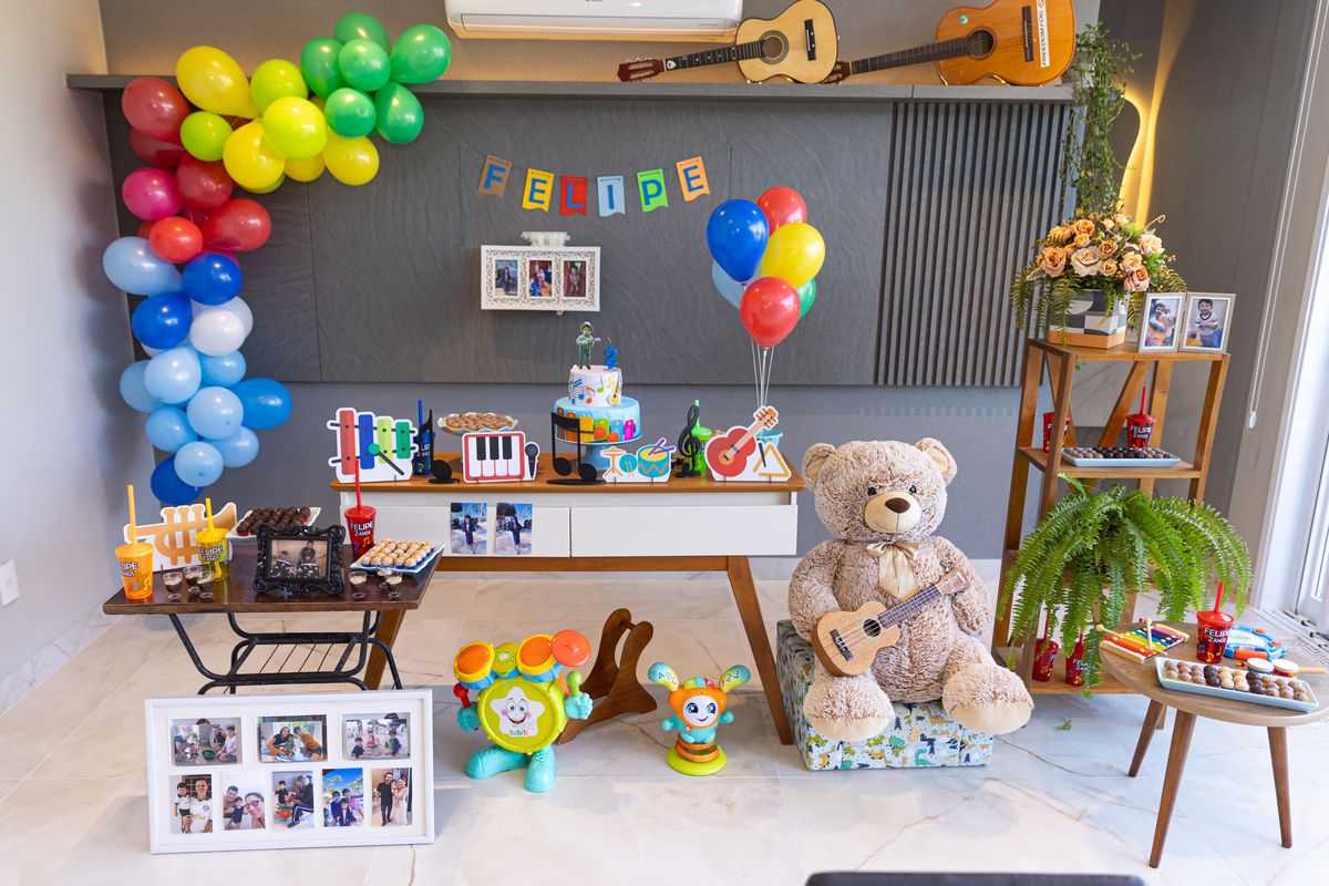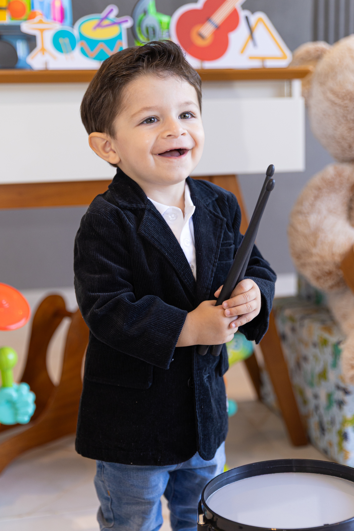 Uma festa animada, cheia de música e alegria — com direito até a bateria nova, que ele ganhou e já estreou todo empolgado! 🥁✨